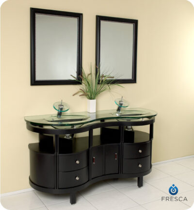 Timeless design is made modern in the compact Fresca Simpatico Modern Bathroom Vanity, model FVN3330ES. Luxurious details like curved legs, chrome-accented handles and a tempered glass sink and countertop make the free-standing table design of this espresso bathroom vanity both contemporary and classic. Two drawers, a shelf and a matching mirror with attached shelves offer maximum storage in a minimalist design.